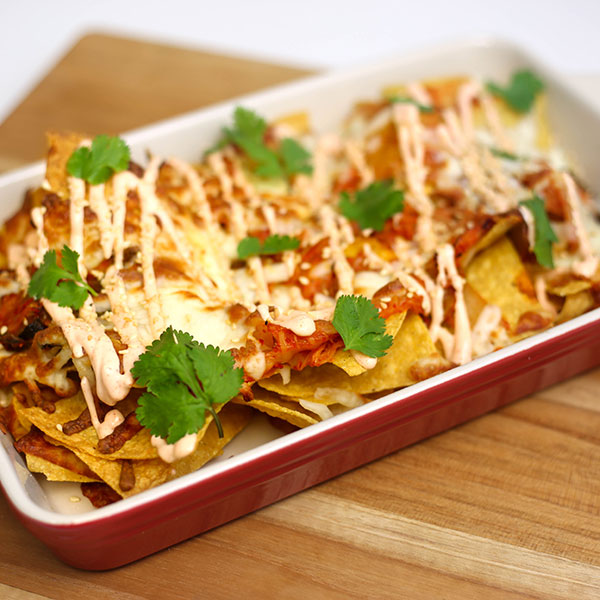 - Top with ½ cup shredded cabbage, ½ cup shredded Chihuahua cheese, and 4 oz of grilled and sliced chicken thighs.