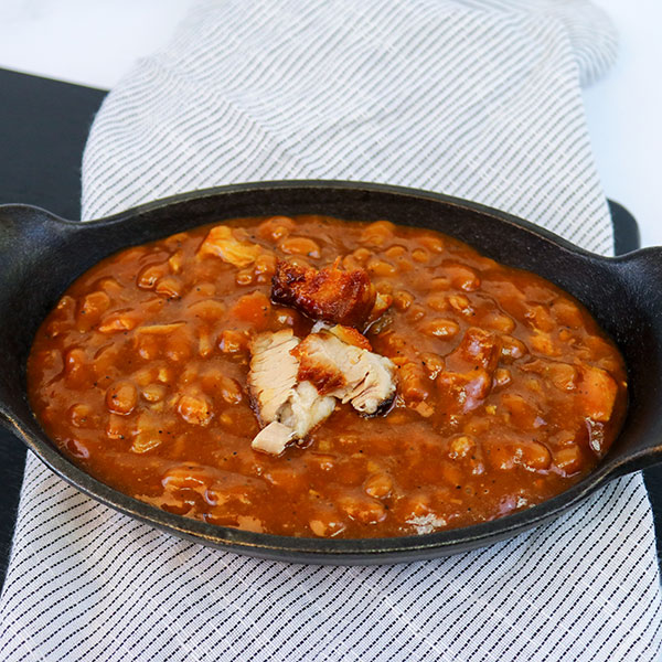 Hearty baked beans in a slightly sweet & savory sauce with a smoky finish. An excellent vegetarian option.