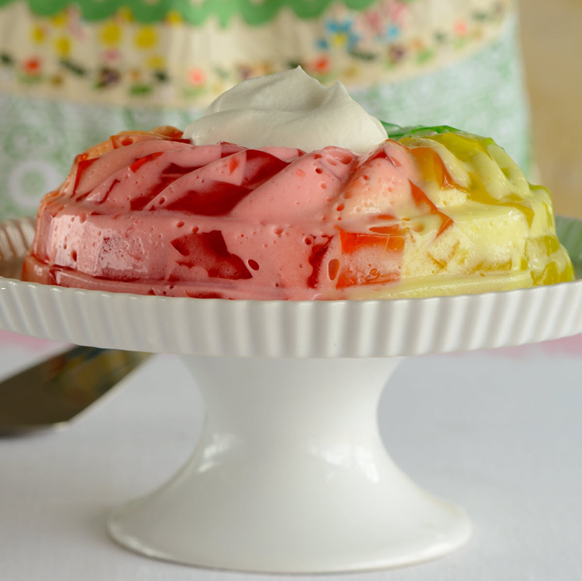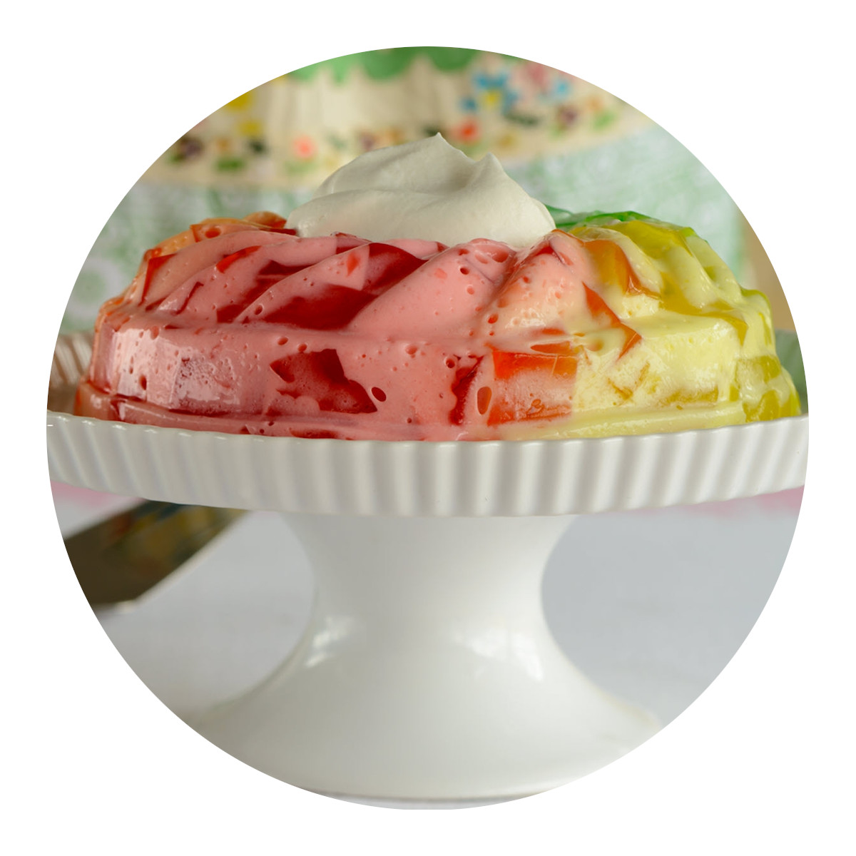This tasty and colorful parfait dessert blends gelatin with a rich whipped topping. The ring mold container allows you to flip it over and place it on a plate for a decorative presentation.