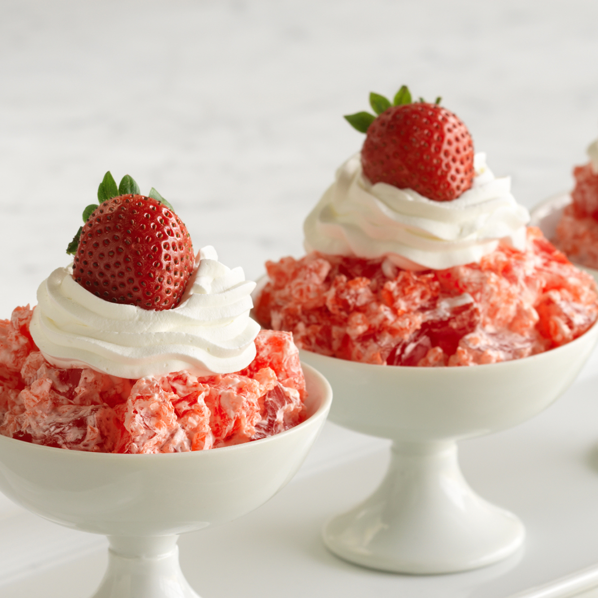 Creamy, rich whipped topping blended with gelatin cubes for a refreshing dessert that can be served on its own or with strawberries on top.