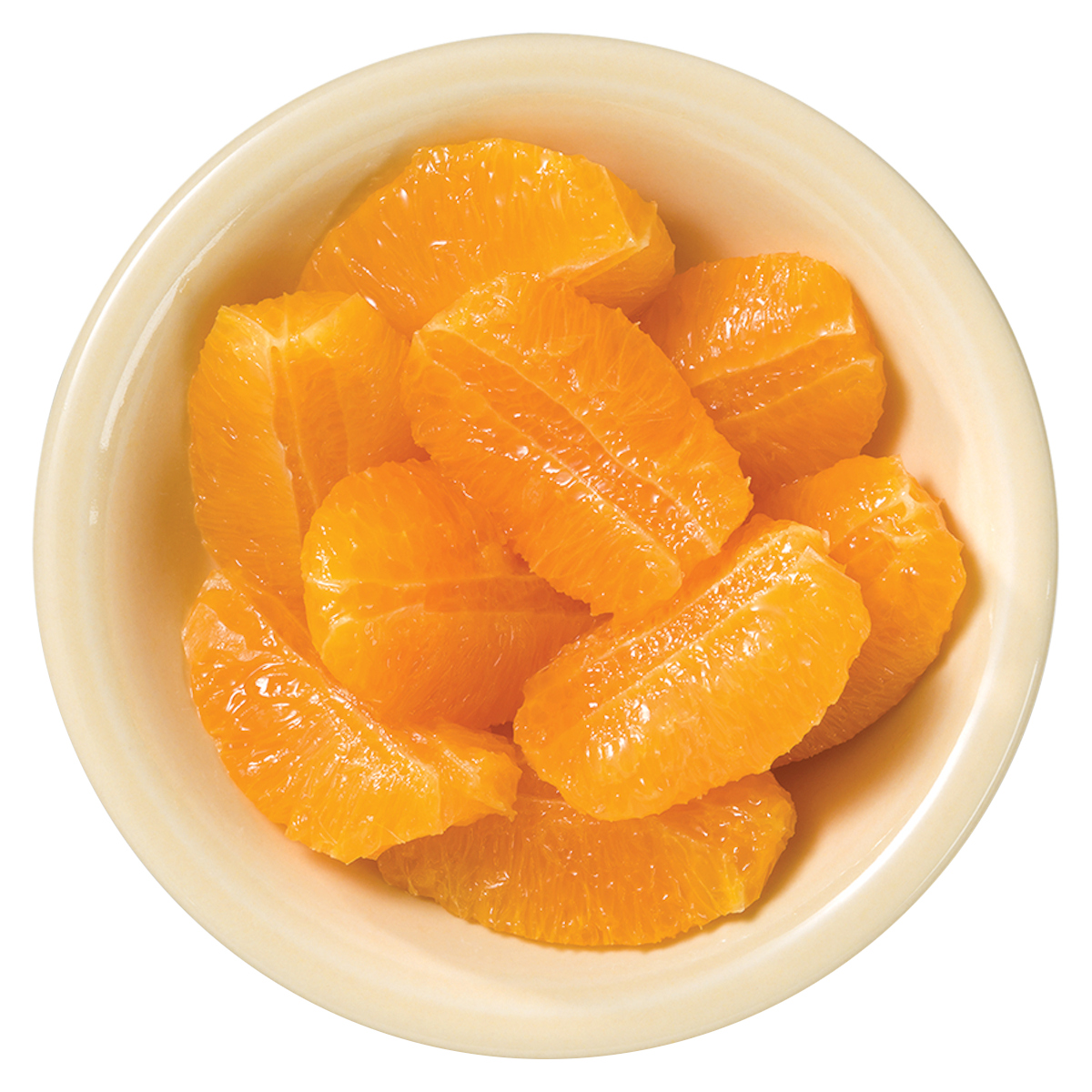 Sweet orange slices trimmed by hand. Our oranges are typically more ripe and flavorful, and have fewer seeds and less membrane.