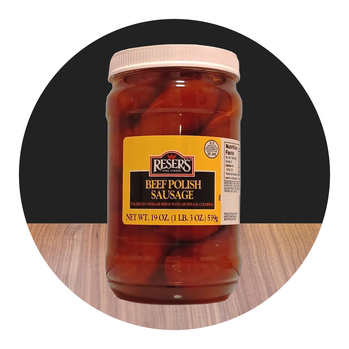 A refrigerated, ready-to-eat product featuring pickled, skin-on sausages. Mild, vinegar-based snack made primarily from beef with a pork casing.