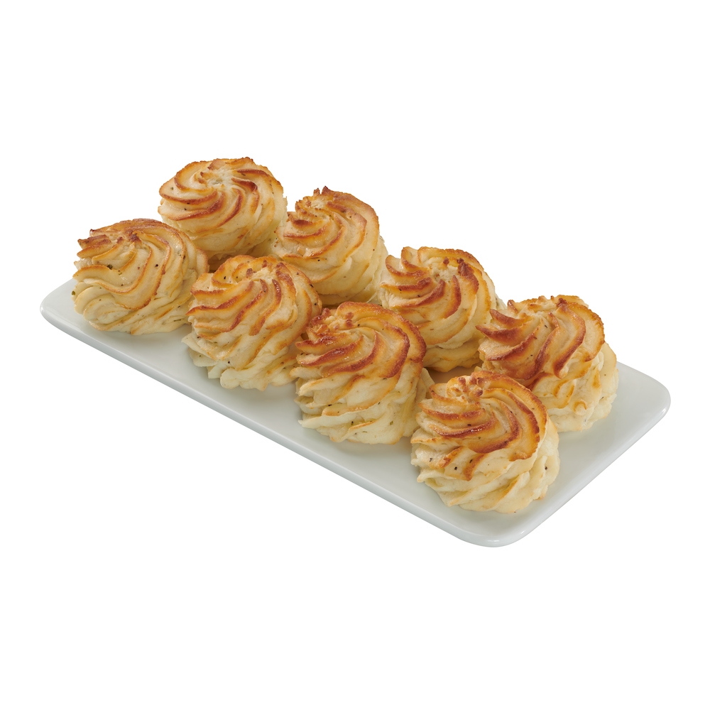 Mashed potatoes made with whole milk, butter, and garlic, piped and baked to golden brown. 8 rosettes per tray.