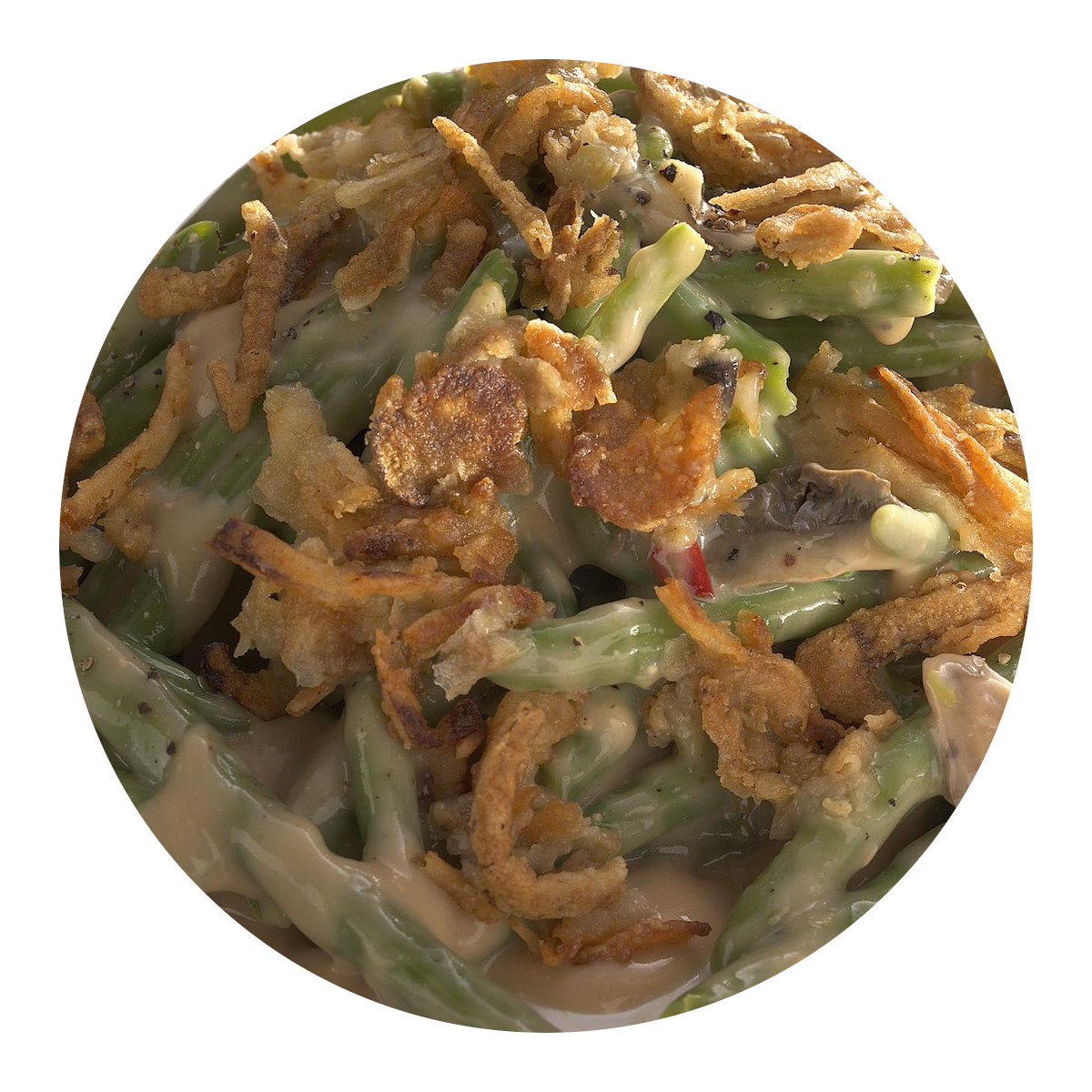 Whole green beans folded into a creamy, from-scratch, chicken and mushroom sauce seasoned with black pepper and spices, gently mixed with diced red peppers, topped with crispy French fried onions.