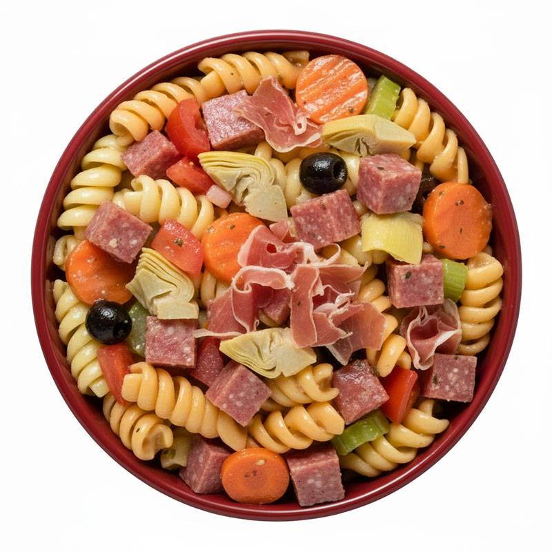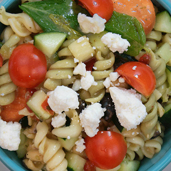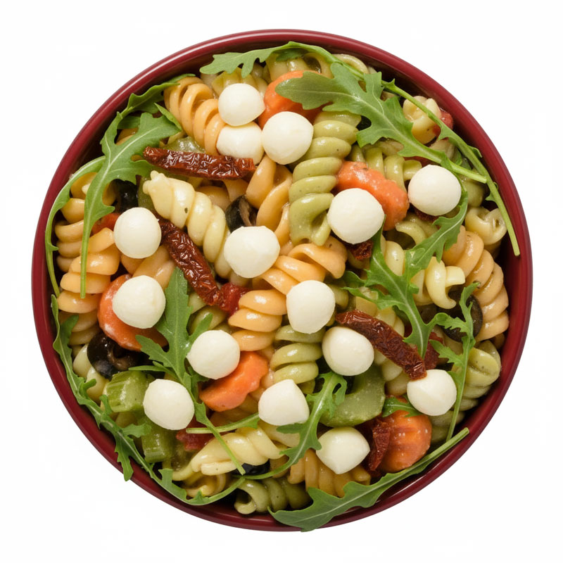 Tri-Color rotini pasta—green, white, and orange—cooked al dente is combined with a zesty Italian herb and Parmesan cheese dressing. Colorful red bell pepper strips, sliced celery, and black olives make this salad a treat for the eye as well as the palate.