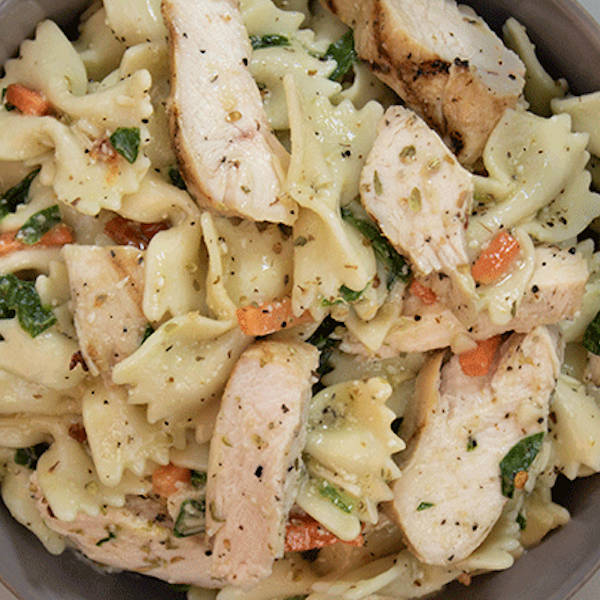 Bow tie pasta is tossed with a Parmesan vinaigrette, sun-dried tomatoes, and fresh spinach. An elegant, upscale salad for lunch or dinner. Perfect on its own or mixed with chicken or seafood.