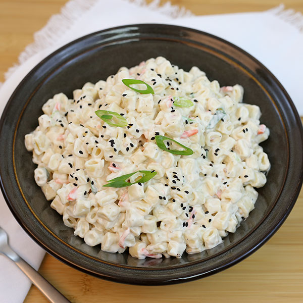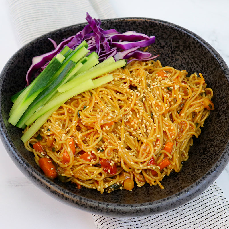 Angel hair pasta in a Korean-style sauce, with sesame, ginger, Gochujang, soy sauce and garlic. Tossed with green onions, red pepper, carrots and water chestnuts.