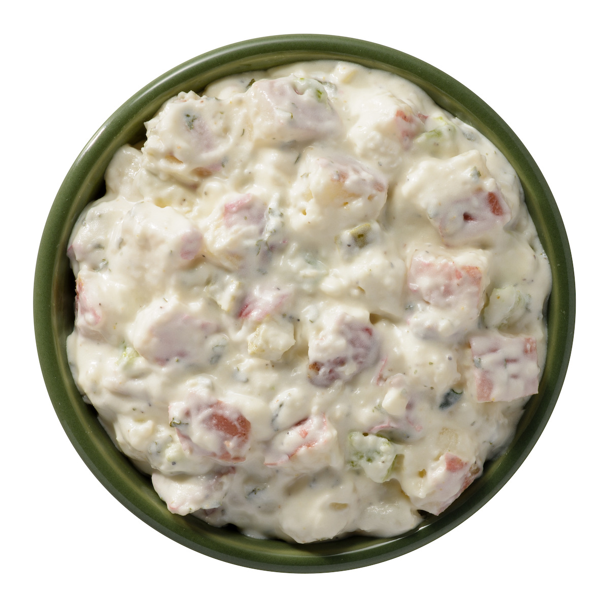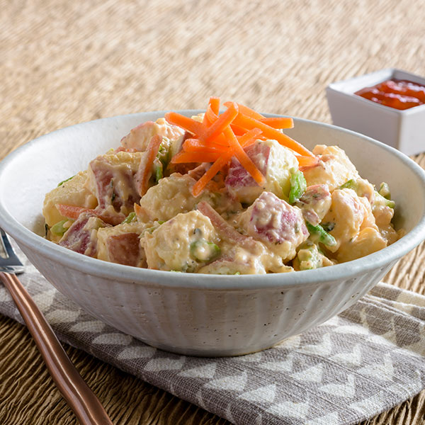 A creamy mild dressing coats tender red skinned potato chunks and onions to this mildly flavored favorite.