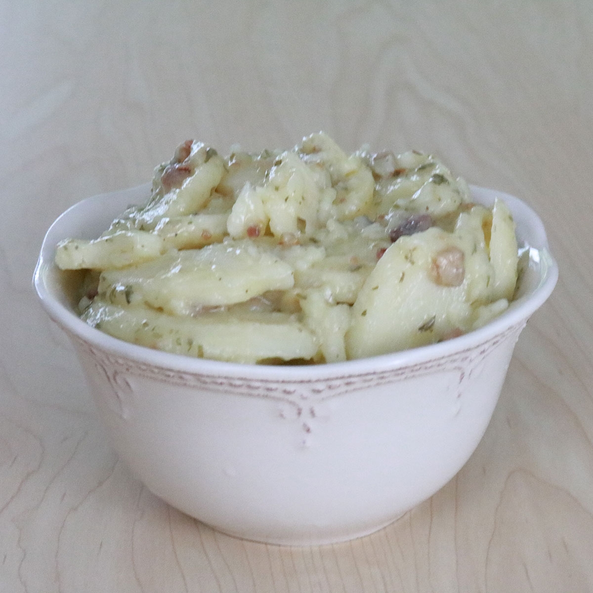 A dressing of savory bacon, red wine vinegar, herbs, and just the right touch of sugar dress this simple salad of sliced potatoes.