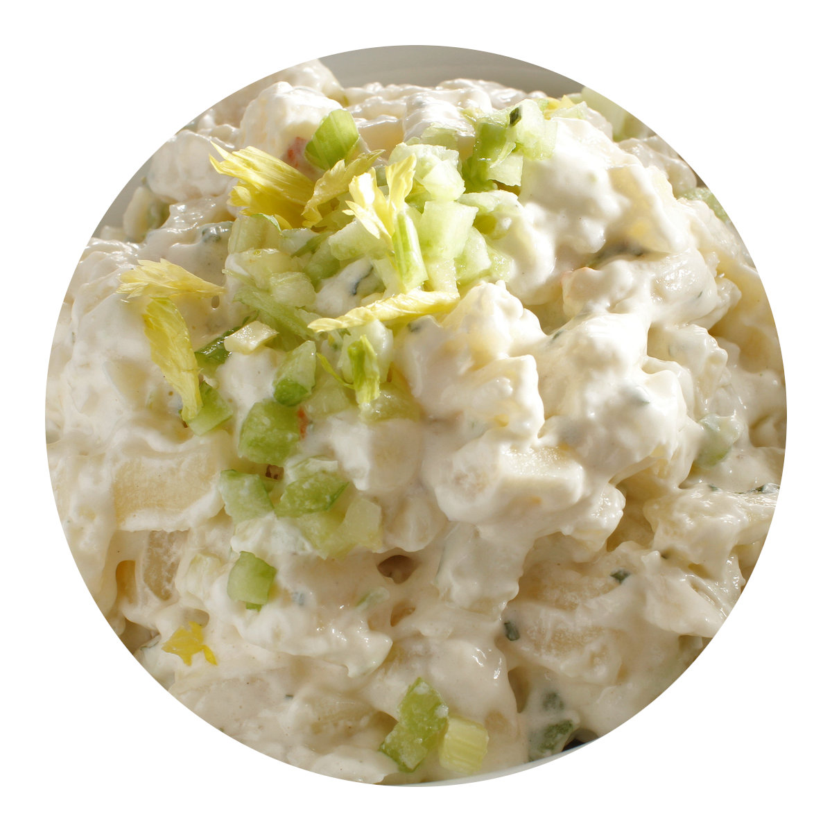 Tender diced and peeled russet potatoes blended into a classic mayonnaise type salad dressing, mixed with crunchy, fresh celery, onions, and green bell peppers, diced red peppers, our signature sweet relish, and a pop of chives.