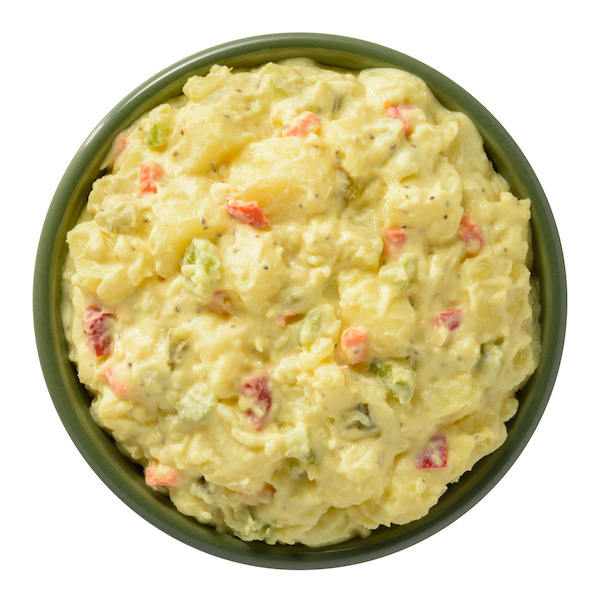 Diced and peeled russet potatoes tossed with a classic blend of mayonnaise and salad dressing, yellow mustard, vinegar, and a touch of sugar, mixed with crunchy, fresh celery and onions, diced red bell peppers, and sweet relish.