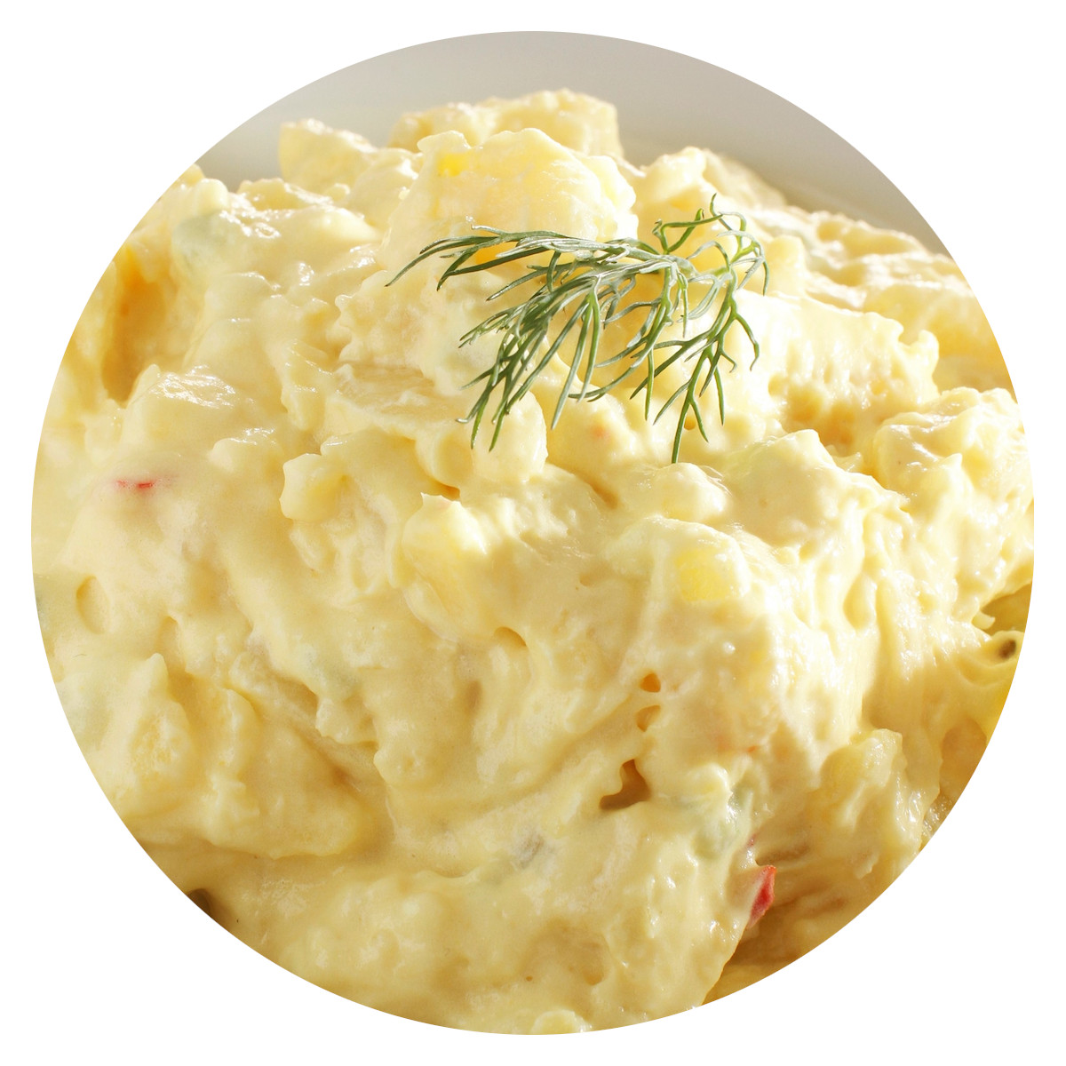 Tender cooked russet potatoes, mixed with a tangy blend of mayonnaise, salad dressing, mustard, and sweet relish. Celery, onions, and red peppers add a pop of freshness and flavor.