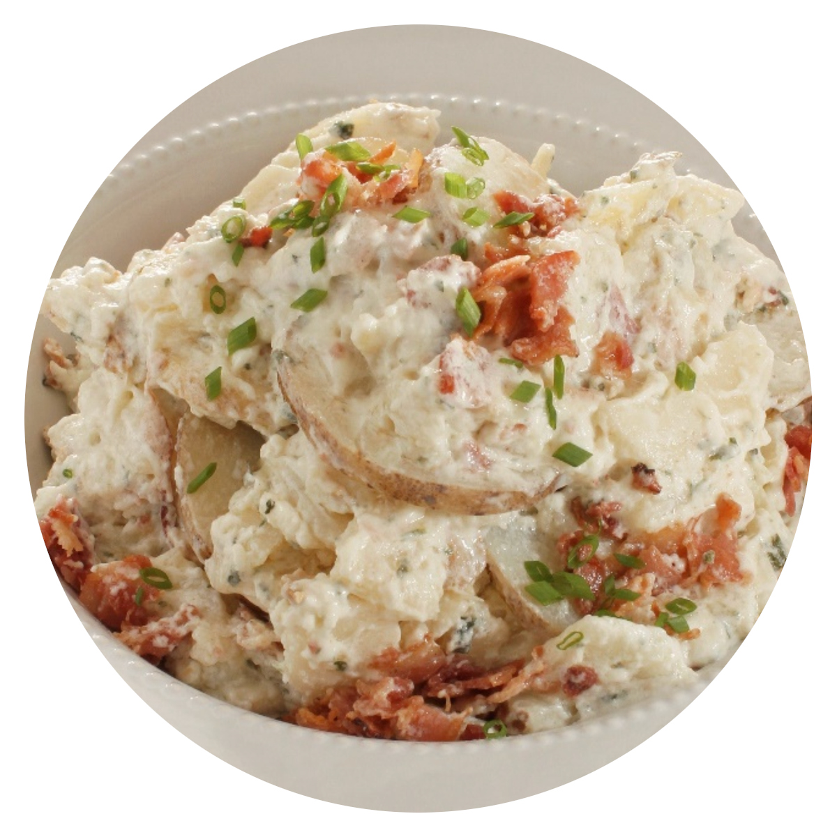 Sliced, skin-on, russet potatoes tossed in a rich mayonnaise and sour cream dressing blended with bacon, green onions, chives, and special seasonings.