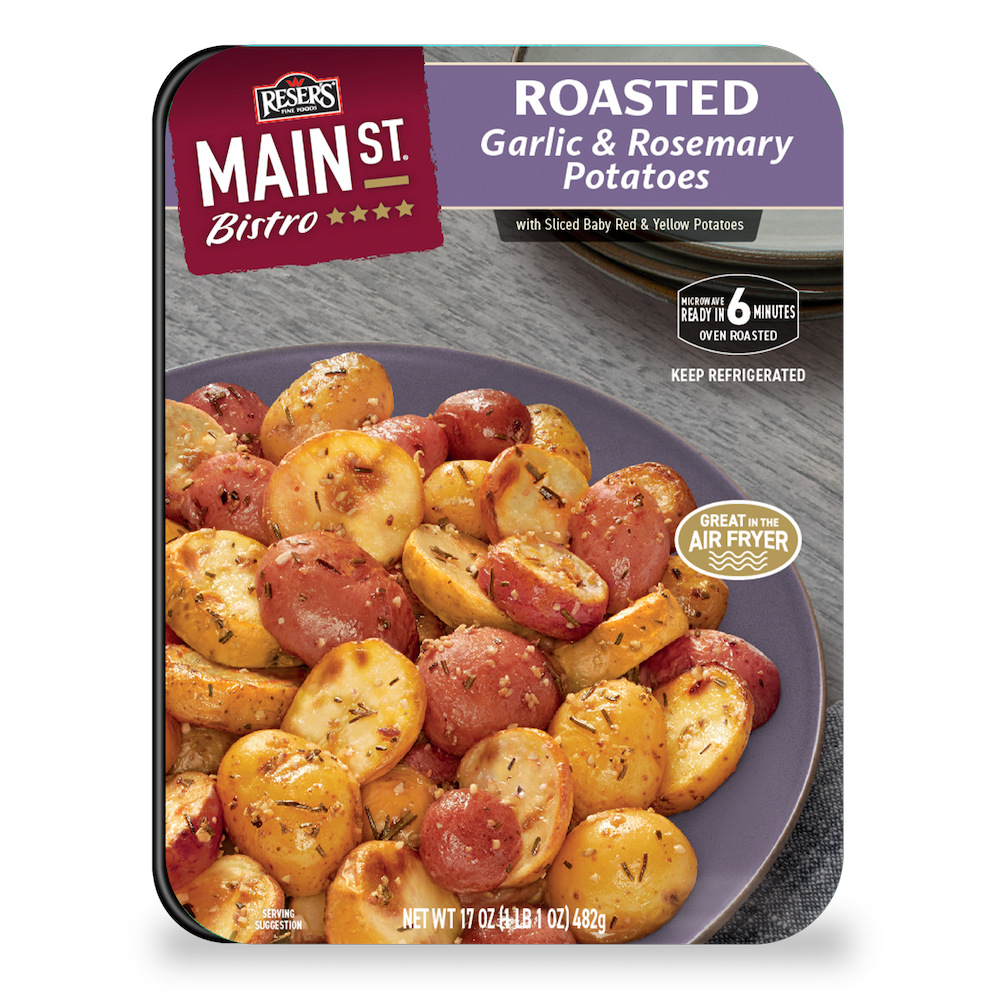 A medley of oven roasted sliced baby red, yellow, and purple potatoes seasoned with garlic and rosemary. No artificial colors or flavors. Preservative free.