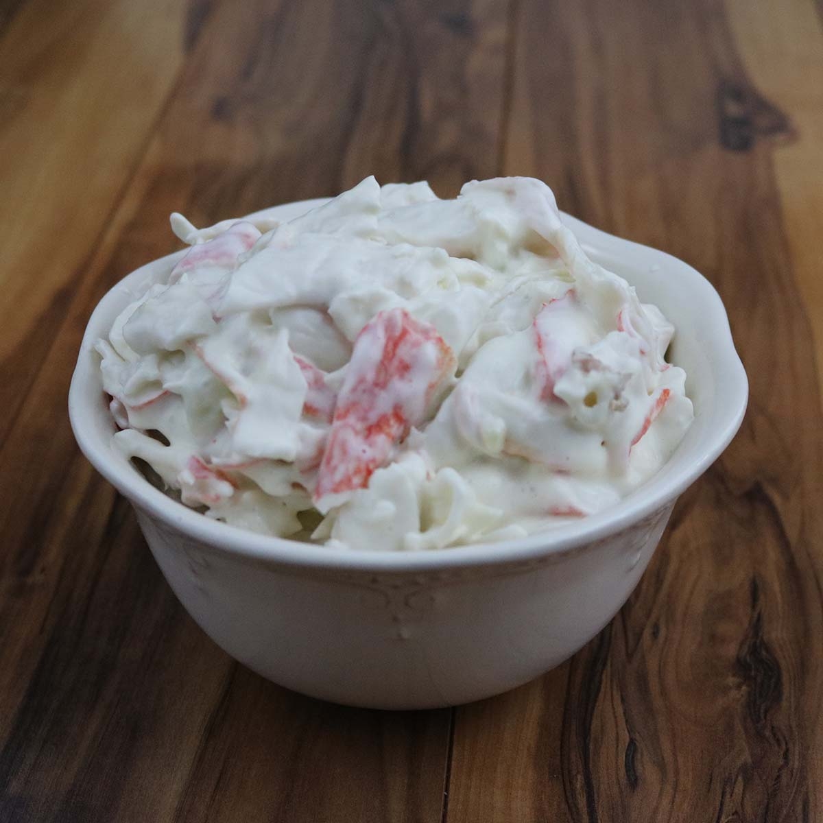 Savory chunks of seafood, lightly dressed in tangy mayo.