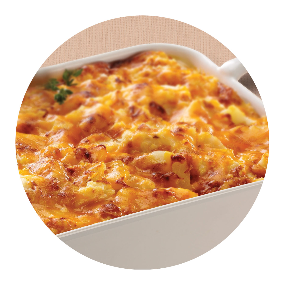 A savory, fully baked casserole of tender sliced potatoes in a rich cream sauce topped with golden-brown melted cheddar cheese. Serve in hot case or cut into portioned cubes for cold case placement. No artificial colors or flavors.