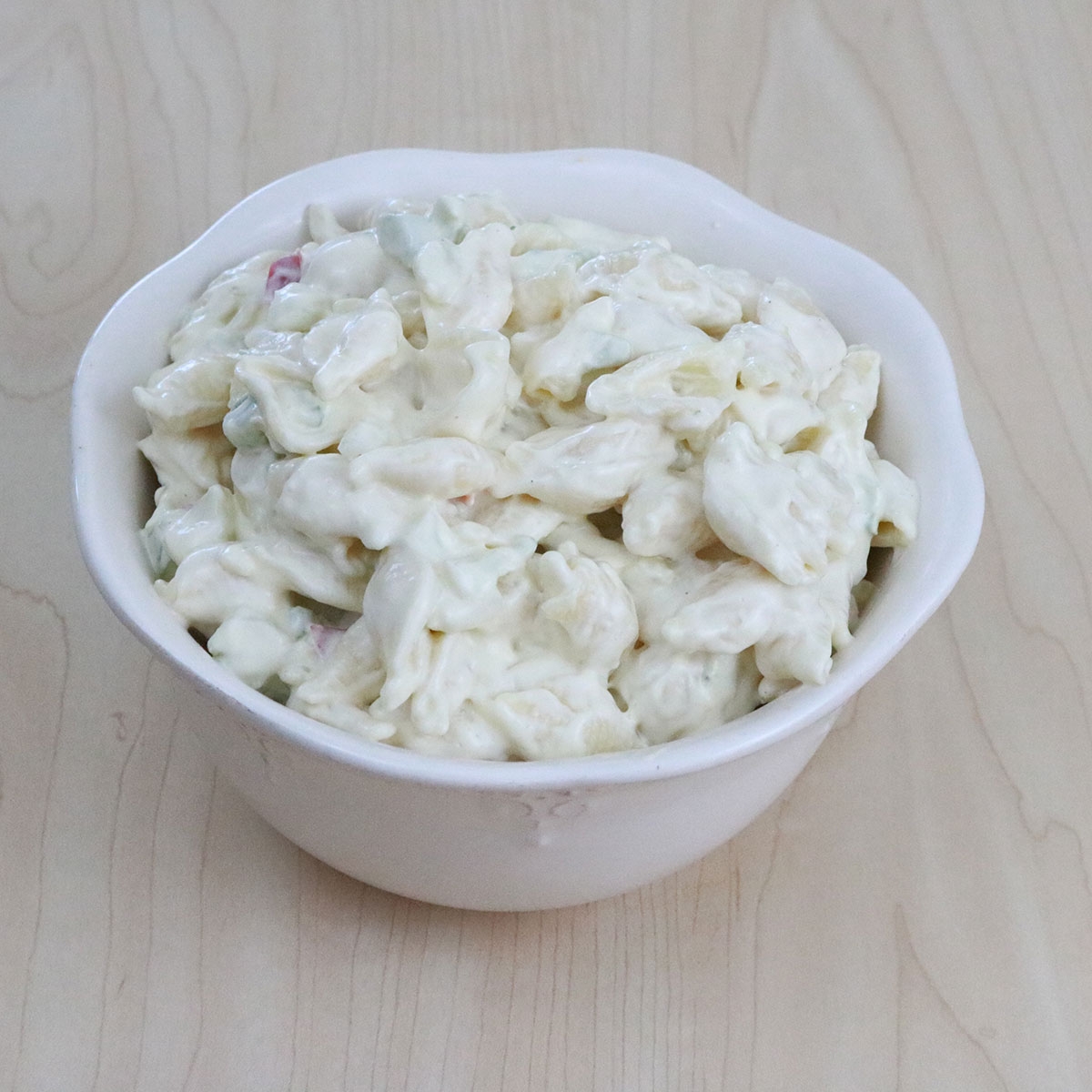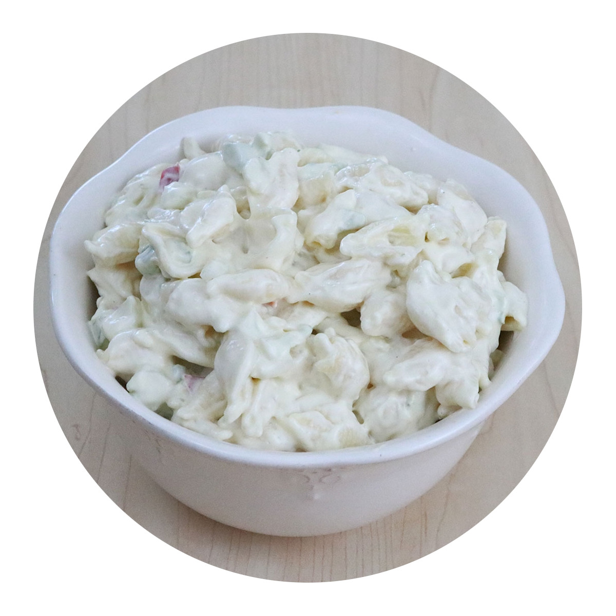 Cooked seashell noodle tossed with a rich dressing, red bell pepper, and blend of savory spices.